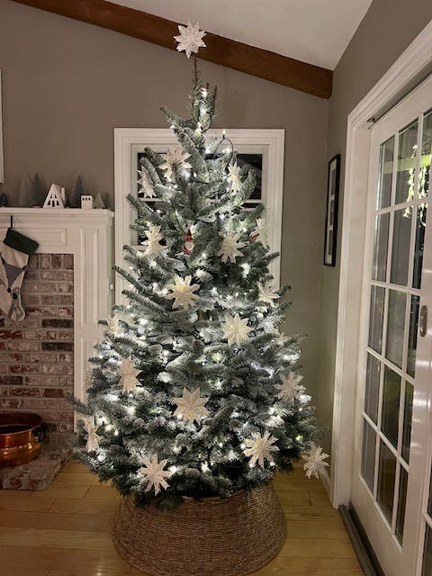 My holiday post is about half written, so I’m swapping Monday and Friday giving myself a few more days to work on it. I’m loving my tree this year, white paper ornaments with one red Santa, and what looks like a Charlie Brown tree topper. It’s mild and soothing after this stressful year.